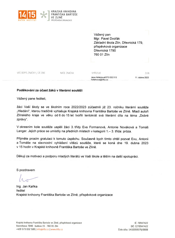 Poděkování za účast žáků v literární soutěži